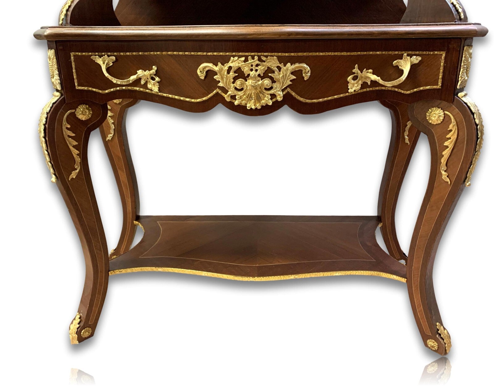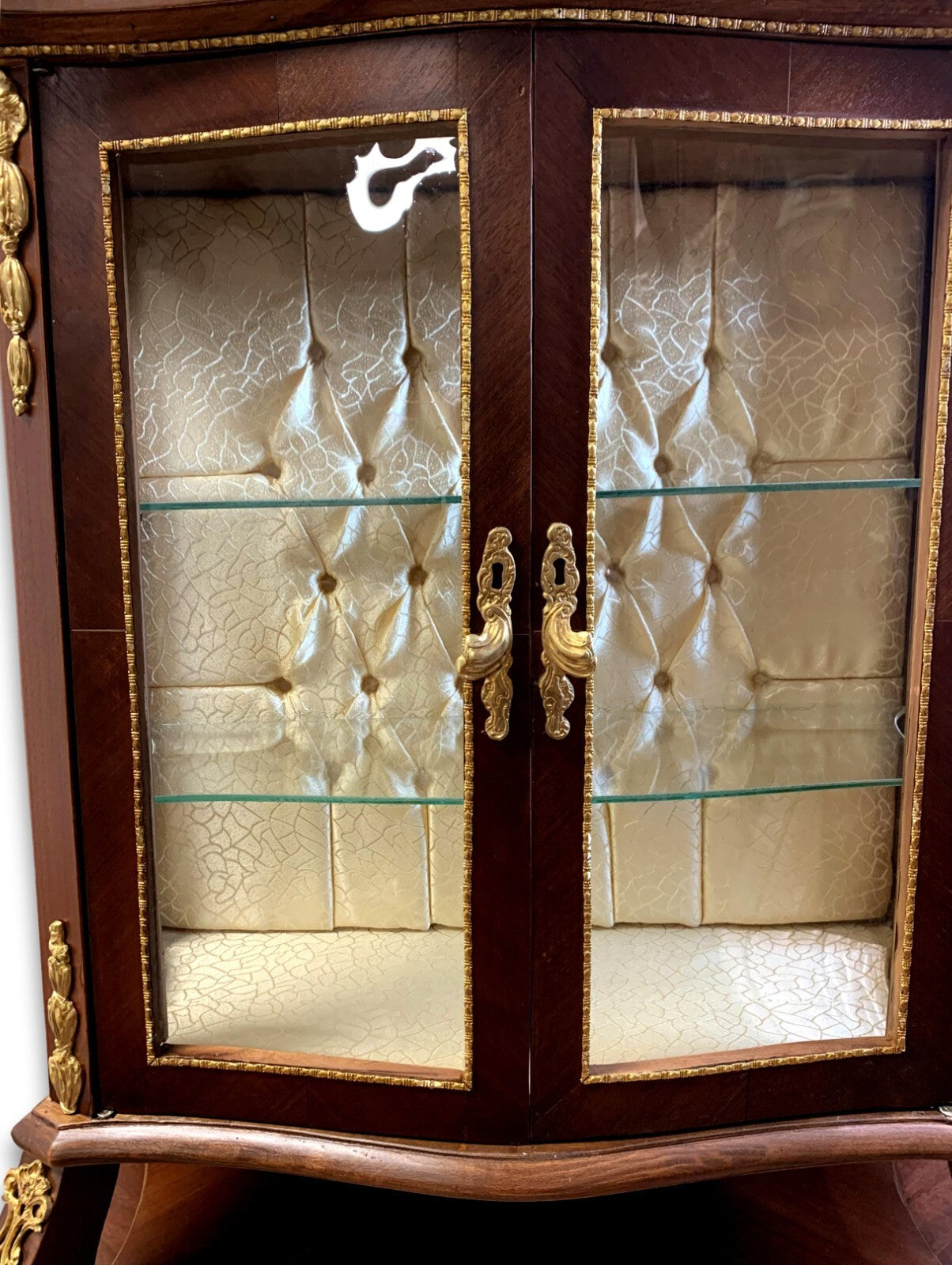 elegante Aufsatzvitrine mit einer Schubladen, barocker Stil nach französischem Vorbild, gefertigt aus Buchenholz mit ausgesuchten Hölzern furniert, hochwertige Handarbeit 'Made in Germany', Oberfläche mittels Natur-Schellack in Nussbaumfarben gearbeitet, Vierfußgestell, geschweifte Beine, Schauseiten mit geschwungenen Gesims, zwei verglaste Fronttüren, verglaste Seitenpartie, reiche goldfarbene Metallbeschläge und Ziehgriffe mit barocker Ornamentik, goldene Metall-Zierbänder, innen Rückwand gepolstert und gesteppt, Vitrinenboden und Rückwand mit hochwertigen und leicht schimmernden Stoff in Krakelee-Musterung bezogen, zwei Zwischenböden aus Glas