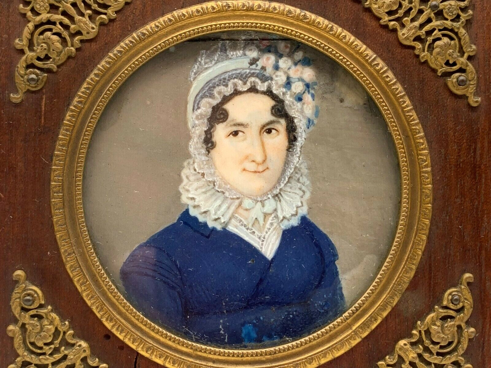 sehr schöne Gouache Miniatur-Lupenmalerei aus der Biedermeierzeit um 1830, Brustbild, Darstellung einer unbekannten Damegerahmt in Holz mit Messingapplikationen, Bild hinter Glas, rückseitig Messingplatte, Wandhalterung, Standhalterung, partiell min. fleckig