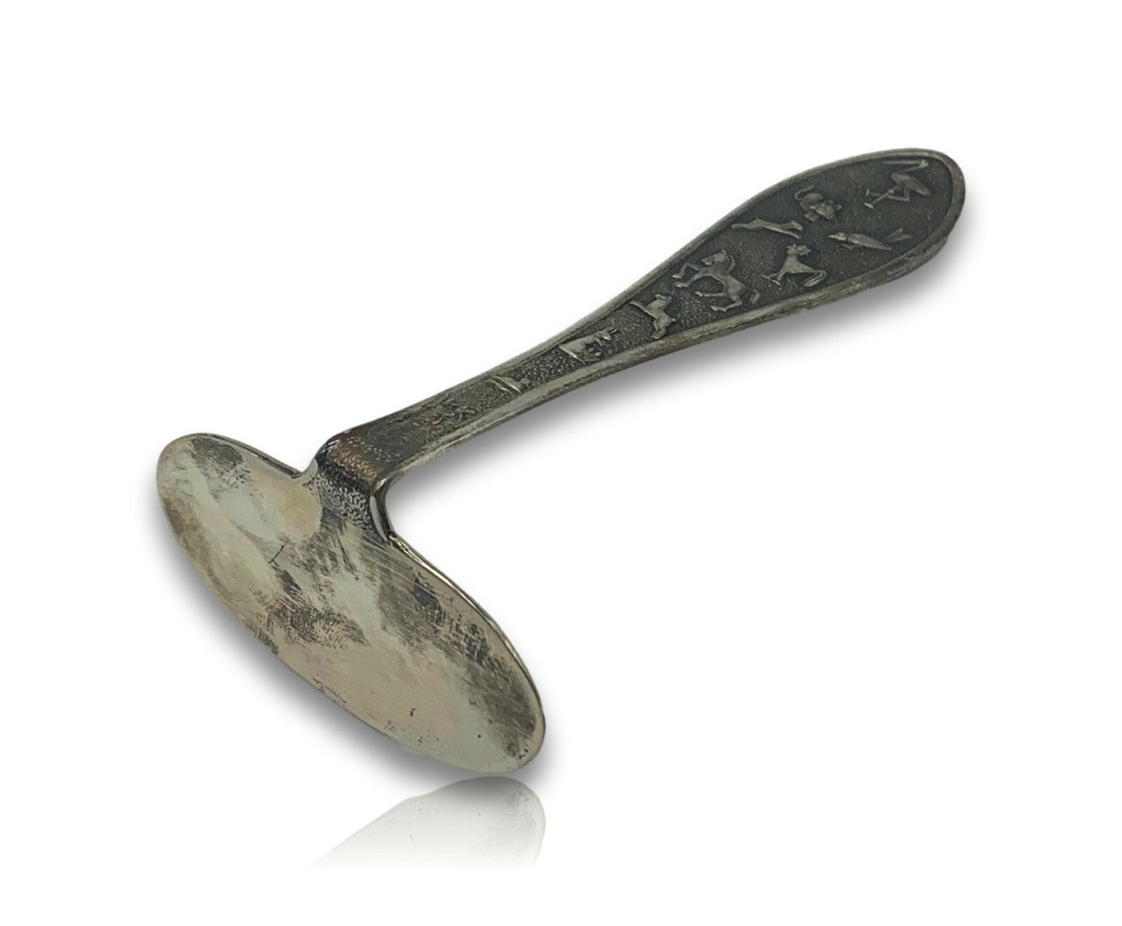 Breischieber/Essenschieber/Schieber gefertigt aus 800er Silber, Karl Kaltenbach-Altensteig, Kinderbesteck, nach Punzierung um ca. 1900, Griff mit feinstem Hintergrundmuster mit heimischen Tieren im Halbprofil nebst Monogramm 'KK' für Karl Kaltenbach, Verso punziert mit 'Halbmond Krone Feingehaltsstempel und Auerhahn, ungereinigt/zarte Patina