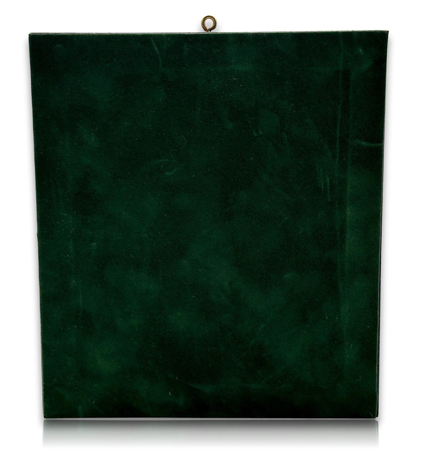 Der Rahmen besteht aus Holz mit marmorierter, grünlich-goldener Lackierung – klassisch jagdlich, aber nicht kitschig. Rückseitig mit Aufhängung versehen.