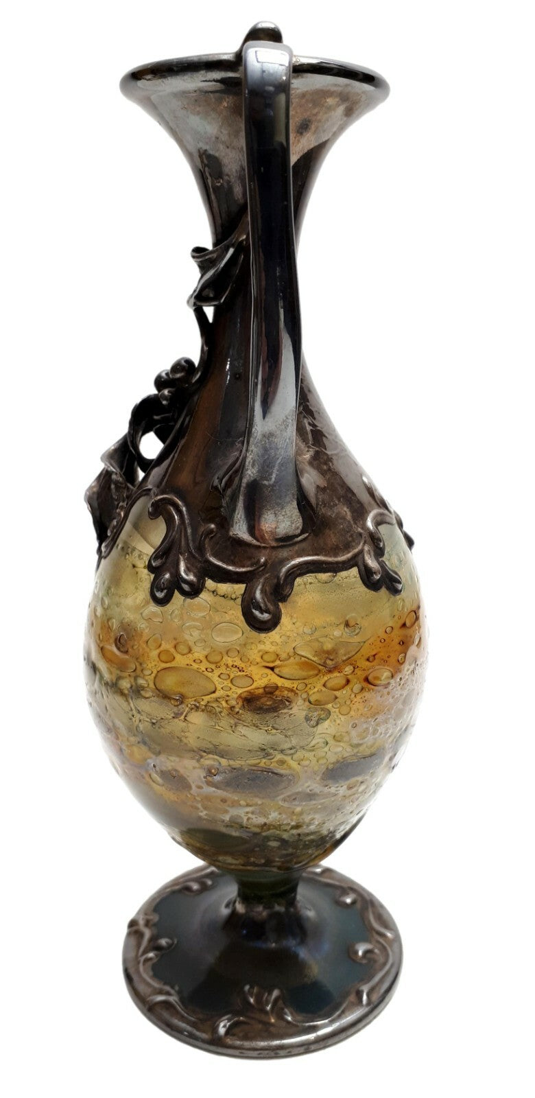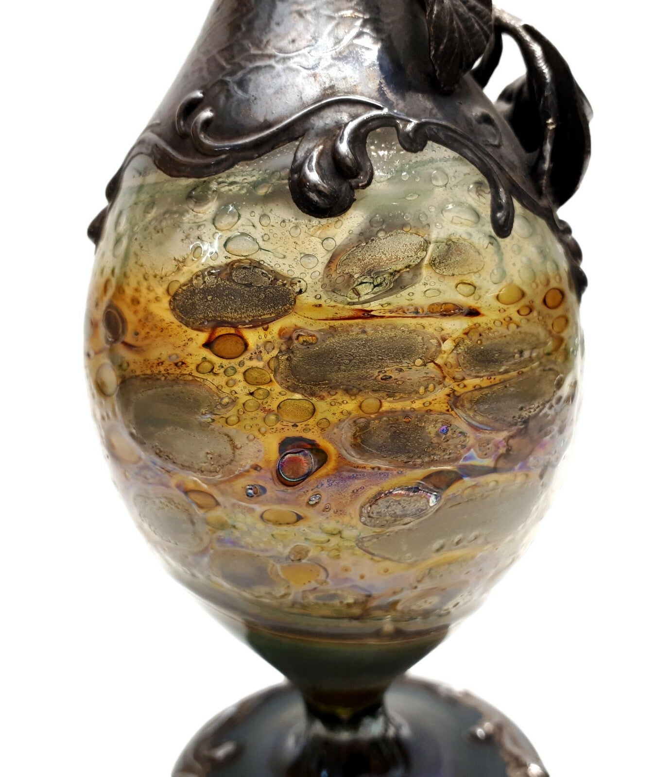kleine Karaffe, dünnwandigen Glas mit Luftblasen- und Farbeinschlüssen geziert, versilberte Montur am Stand und Karaffenhals in geschwungenden Rocaillen, plastisch aufgesetztes Blätterwerk