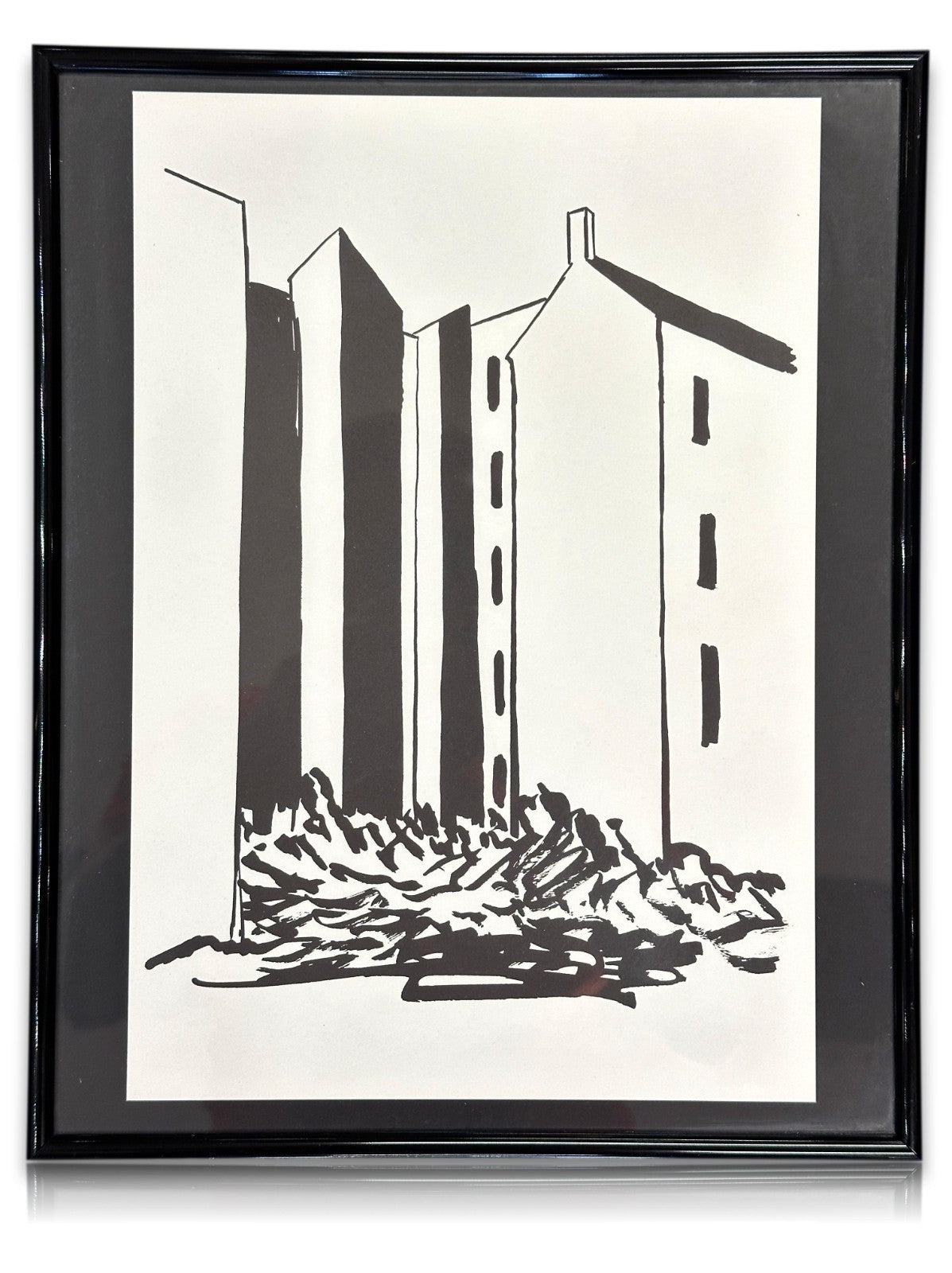 Die reduzierte Darstellung zeigt zerstörte Wohnhäuser mit rauem Trümmerfeld – vermutlich eine Anspielung auf die Berliner Nachkriegszeit. Mit wenigen, präzisen Linien schafft Heldt eine eindringliche Szenerie zwischen Hoffnung und Resignation.