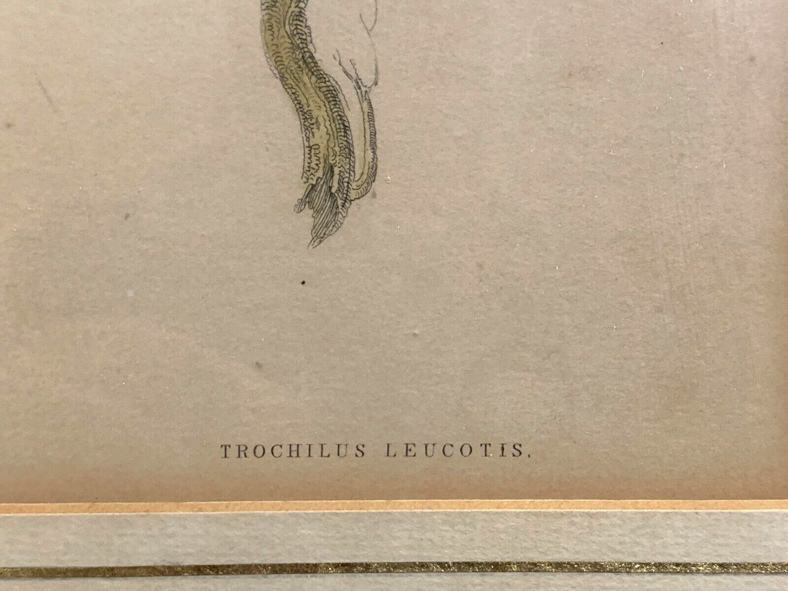 ornithologischer Stich, gezeichnet und gestochen von 'William Home Lizars' um 1820 - abgebildet: 'Trochilus leucotis' - Purpurstirn-Saphirkolibri, sehr detaillierte Handkoloration - gerahmt hinter Glas - Passepartout, Zustand siehe Bilder